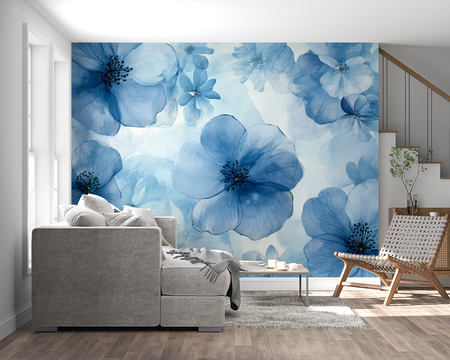 Mural Watercolor Floating Blue Flowers Wallpaper
