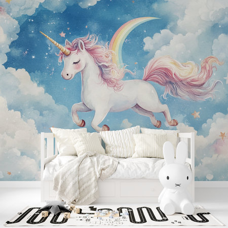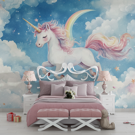 Mural Unicorn Wallpaper Decoration for Boy's Room with Rainbow and Blue Sky