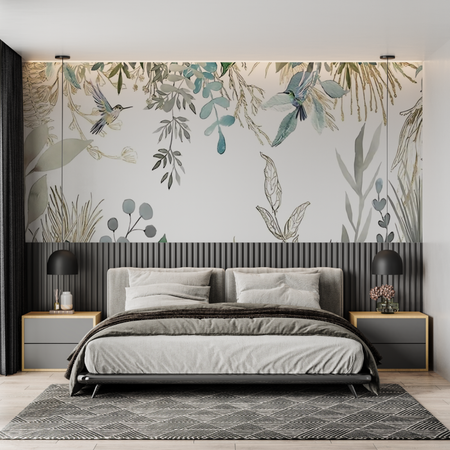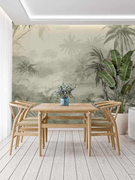 The minimalist color scheme enhances light in narrow or dimly lit rooms while maintaining the exotic charm of the jungle theme. It’s ideal for those who appreciate clean lines and understated elegance without sacrificing character.