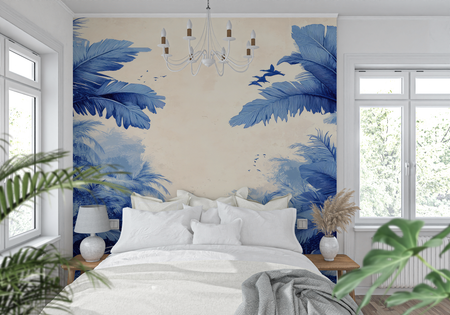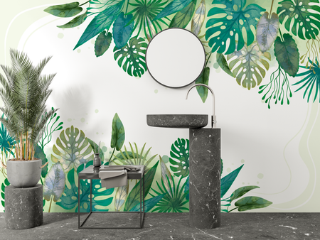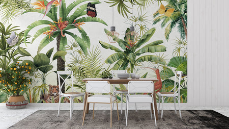 The minimalist color scheme enhances light in narrow or dimly lit rooms while maintaining the exotic charm of the jungle theme. It’s ideal for those who appreciate clean lines and understated elegance without sacrificing character.