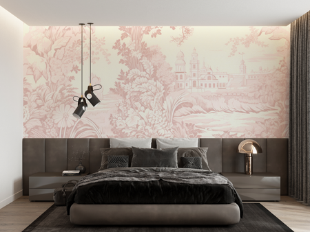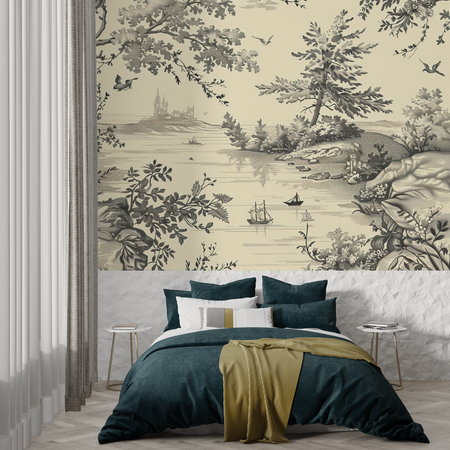 Create a peaceful, vintage-inspired retreat by placing Toile de Jouy wallpaper behind the bed. Combine it with neutral linens and light cotton curtains to complete the look.