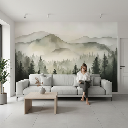 Watercolor Misty Pine Mountains Mural Wallpaper