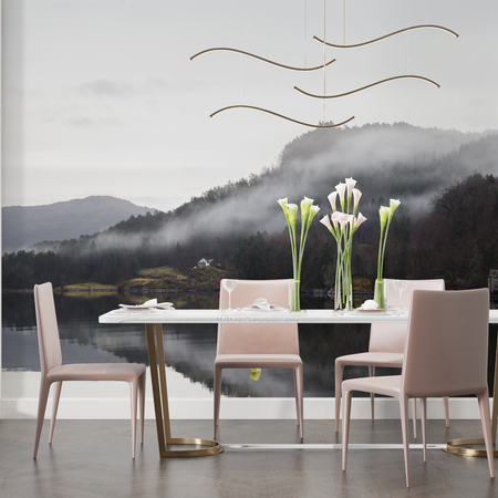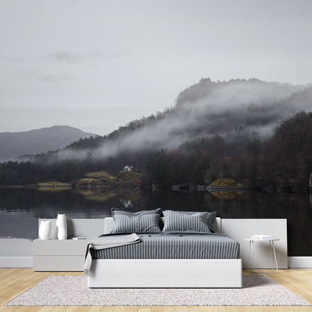 Wandbild mit Aquarellwaldmotiv, eingehüllt in Nebel