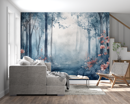 Wandtapete mit Aquarellmotiv und sanftem Waldmotiv