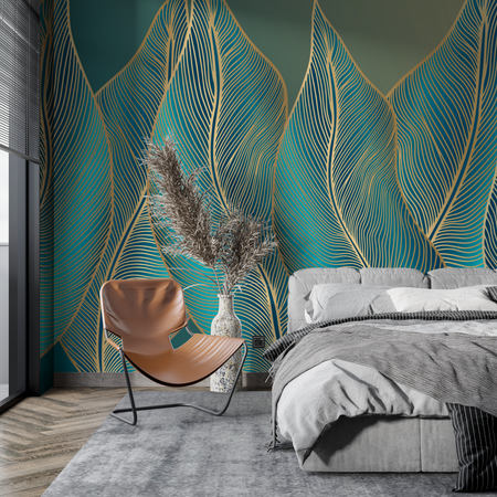 Wandtapete im Art-Deco-Stil, Gold und Petrolblau
