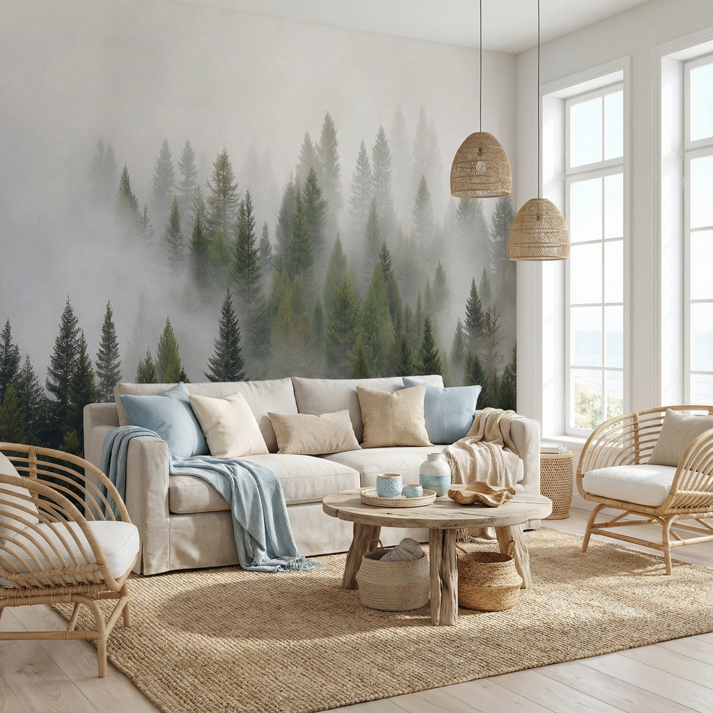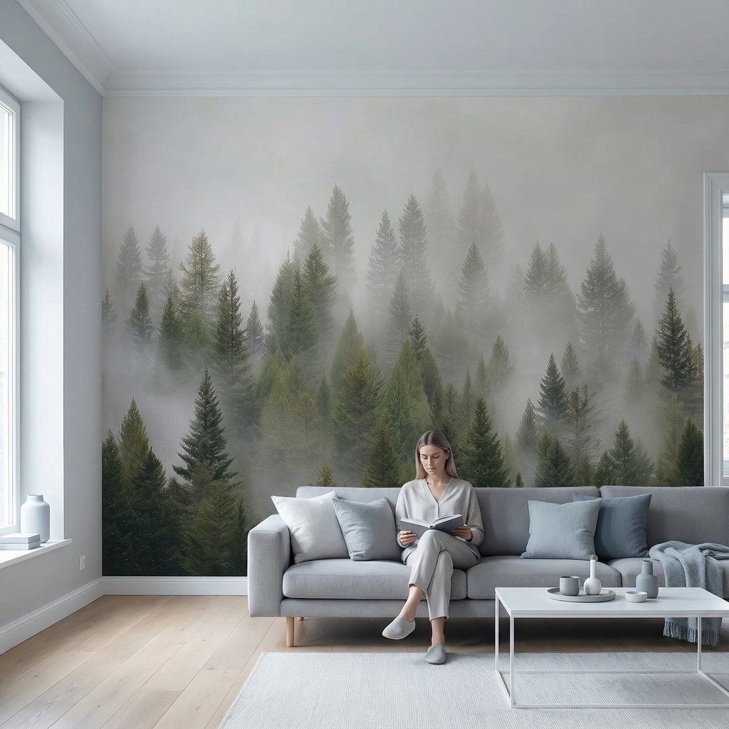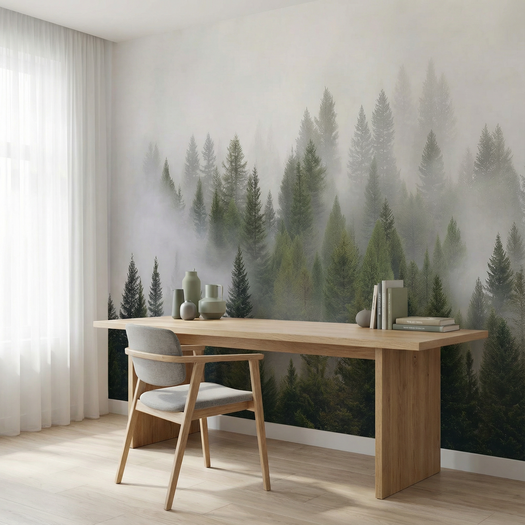 Wandtapete „Nebeliger grüner Kiefernwald“