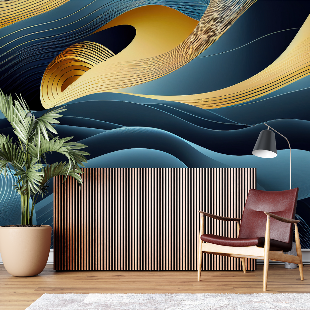 Wandtapete „Blaue und goldene Wellen“ im Art-Deco-Stil