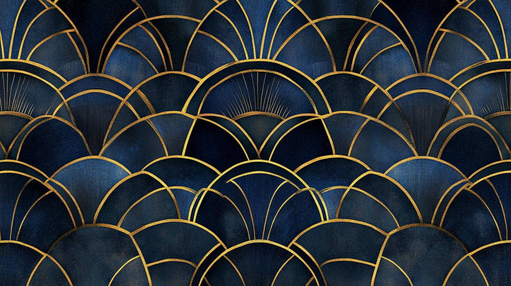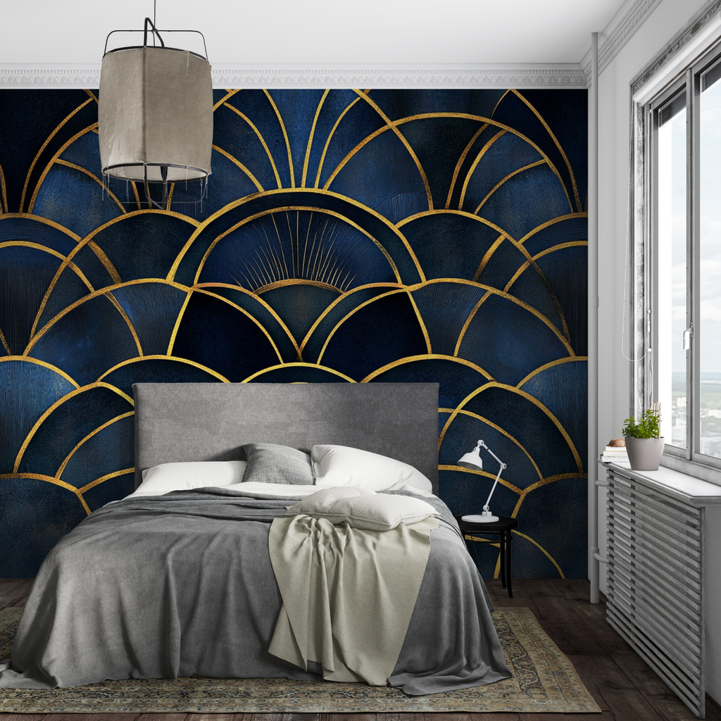 Wandtapete in Blau und Gold im Art-Deco-Stil