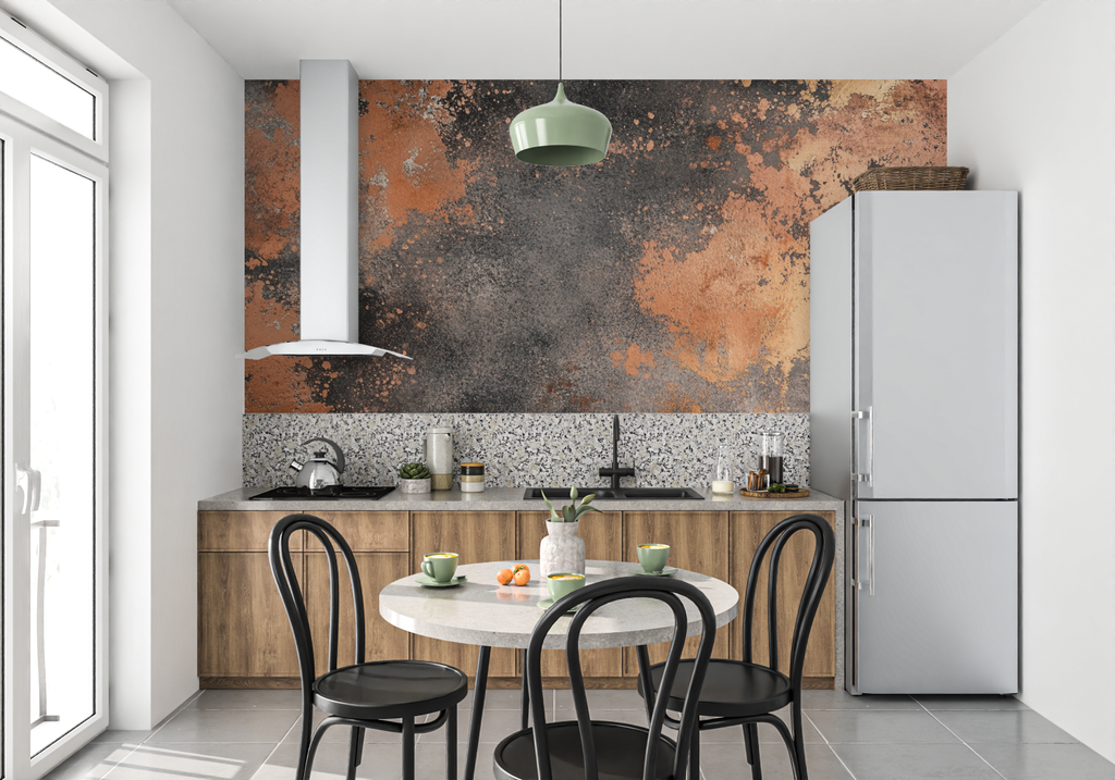 Wandtapete in Terrakotta und oxidiertem Kupfer