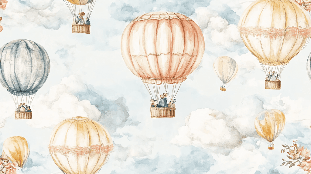 Diese Vintage Aquarell Heißluftballon Tapete ist viel mehr als nur ein Wandbelag – sie ist ein Stück Kunst direkt in Ihrem Zuhause. Stellen Sie sich weiche Ballons vor, die träge durch einen sanften blauen Himmel schweben, mit warmen Beige- und Brauntönen, die jeden einzelnen schmücken, alles vor dem Hintergrund flauschiger weißer Wolken.
