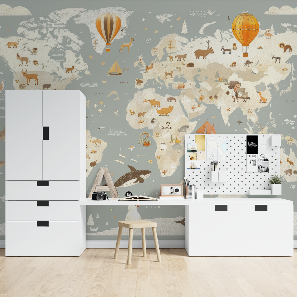 Mural World Map Wallpaper with Animals