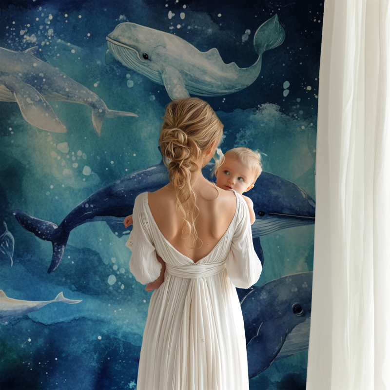 Observe mais de perto e você verá baleias dançando em meio à água — detalhes que iluminam o espaço infantil e despertam pura emoção. Este papel de parede não apenas decora; ele prepara o cenário para um mundo subaquático mágico , onde a curiosidade e a calma reinam.